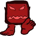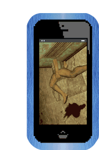 Pixel art smartphone displays a glitchy image of a person's legs seemingly stuck in a confined space, with a dark stain nearby.