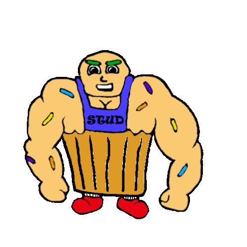 A muscular, cartoon cupcake character, a 'stud muffin,' flexing its bicep with a confident smile.