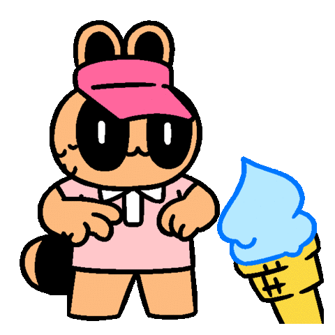 A cute raccoon character, dressed as an ice cream vendor, looks hot and bothered next to a melting soft-serve ice cream cone.