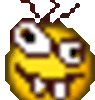 A pixelated, goofy yellow emoji with a large eye, buck teeth, and a bee buzzing above its head, blinking and sticking out its tongue.