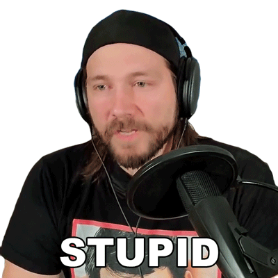 Michael Kupris, wearing a beanie and headphones, looks on with a serious expression as the word "STUPID" appears, conveying foolishness.