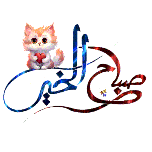 A charming animated sticker featuring a fluffy cat holding a red heart, with sparkling Arabic calligraphy for 'Good Morning'.