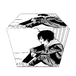 Miri Sugo from Chainsaw Man in two distinct manga-style poses, first looking up and then crouching down.