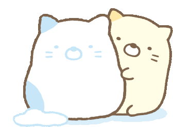 Two adorable Sumikko Gurashi cats, one white and one yellow, with the yellow cat peeking shyly from behind the white one.