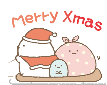 Sumikko Gurashi characters Shirokuma, Penguin?, and a pink friend ride a sleigh pulled by a reindeer snail, with falling snowflakes and 'Merry Xmas' text.
