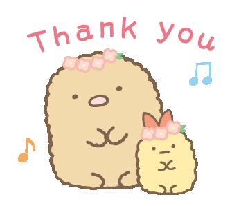 Sumikko Gurashi characters Tonkatsu and Ebifurai no Shippo with flower crowns say 'Thank you' with musical notes.