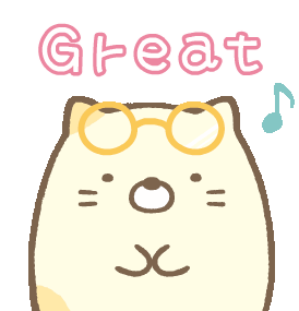 A cute Sumikko Gurashi cat character wearing glasses expresses enthusiasm by saying 'Great' with a musical note.