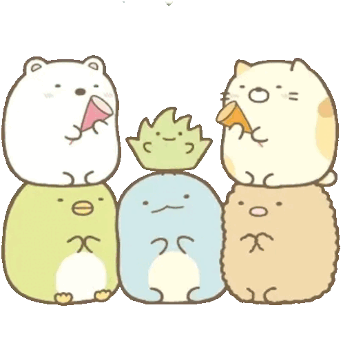 Sumikko Gurashi characters Shirokuma, Penguin?, Neko, Tokage, and Tonkatsu celebrate with confetti and party blowers.
