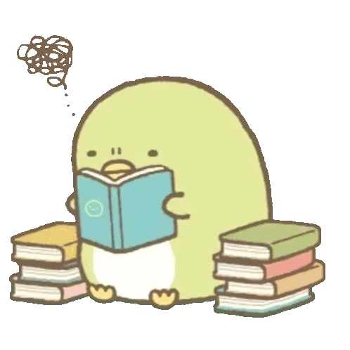A cute Sumikko Gurashi penguin character, surrounded by books, gets frustrated while reading and throws its book in annoyance.