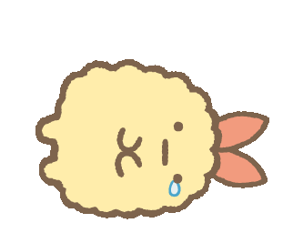 A cute Sumikko Gurashi character, Ebi Fry no Shippo, looks sad with a tear, then tumbles and lies on its side, still appearing dejected.