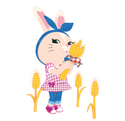 A cute cartoon bunny, likely Summer from 'Summer and Todd', holds and smells a bouquet of wheat, joined by a small butterfly.