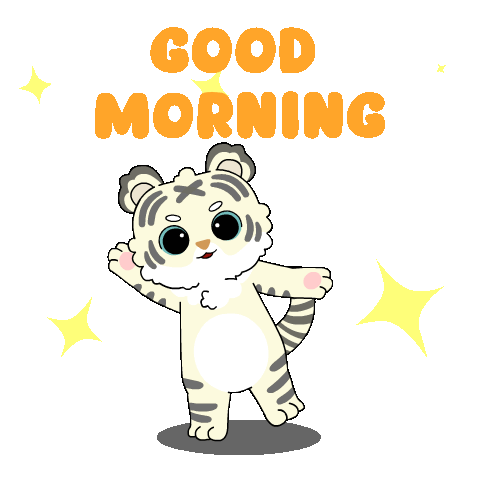 A cute cartoon white tiger waves with 'GOOD MORNING' text, perfect for a cheerful summer greeting.