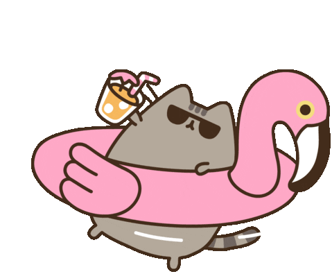 Pusheen the cat, wearing cool shades, floats on a pink flamingo inflatable with a refreshing drink, enjoying a relaxing summer vacation.