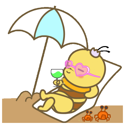 A cute cartoon bee in heart-shaped sunglasses relaxes on a beach chair under an umbrella, sipping a drink.