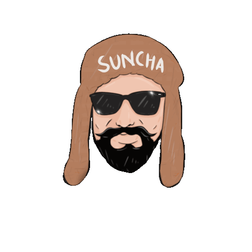 A cartoon sticker featuring Suncha Vox wearing a brown ushanka hat with 'SUNCHA' written on it, and cool sunglasses.