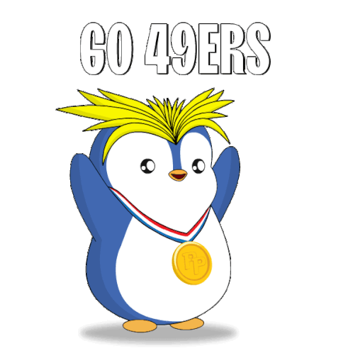 A cute cartoon penguin with yellow hair and a medal, cheering "GO 49ERS" for Sunday football and Super Bowl.