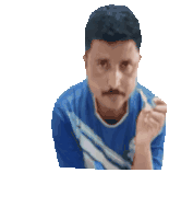 Sunil Bgs Sunil Kumar, a man with a mustache in a blue shirt, looks intently at the camera while holding an object to his mouth.