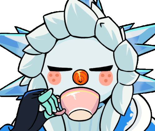 Fortnite character Sunspot, a spiky ice creature, contentedly sips from a pink teacup, enjoying a warm drink.