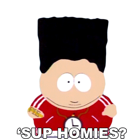 Eric Cartman from South Park greets with his iconic phrase, 'Sup Homies?', in this animated sticker.