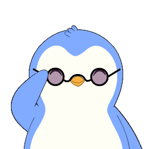 A cute blue and white penguin wearing glasses with the word "SUP" floating above its head, greeting with a friendly "wassup".