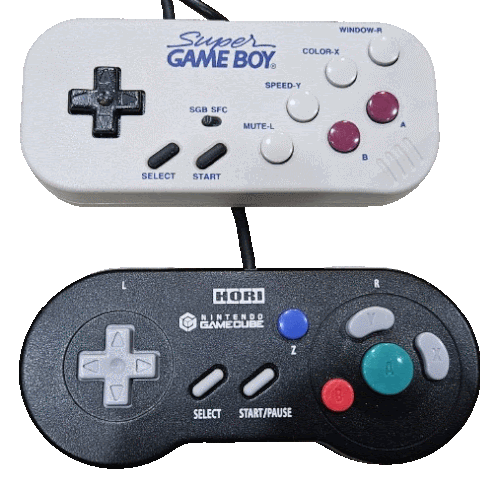 a white super game boy controller next to a black hori controller