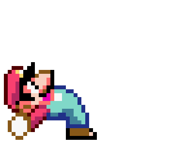 Super Mario, the iconic Boi, is depicted in classic pixel art style, crouching down in his signature red and blue outfit.