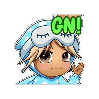Super Victor Universe Svu character in pajamas and sleep mask waves goodnight with a 'GN!' sign, ready for sleep.