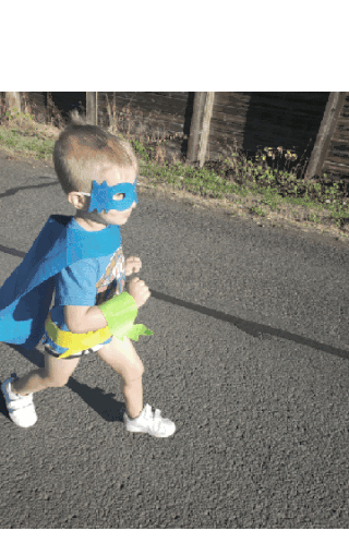 A determined little superhero child runs with a blue cape and mask, ready for adventure.
