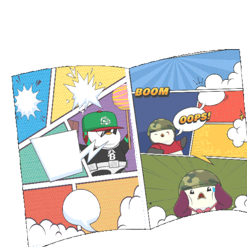 Pudgy Penguins in a vibrant comic book scene, featuring a superhero penguin with powers and action text like 'BOOM' and 'OOPS'.