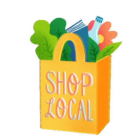 Animated sticker featuring a vibrant shopping bag with 'SHOP LOCAL' text, promoting community support. By yanyancandyng.