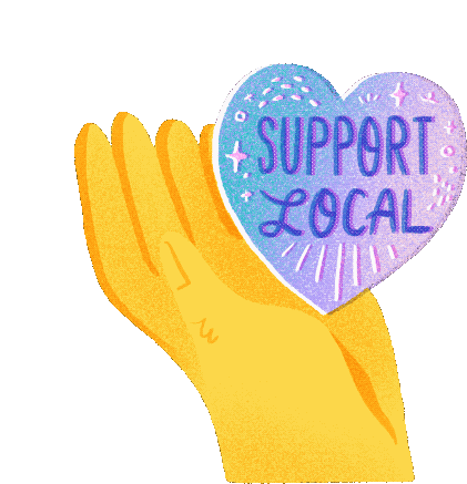 A vibrant animated sticker featuring a yellow hand holding a sparkling blue heart with the message 'SUPPORT LOCAL'.