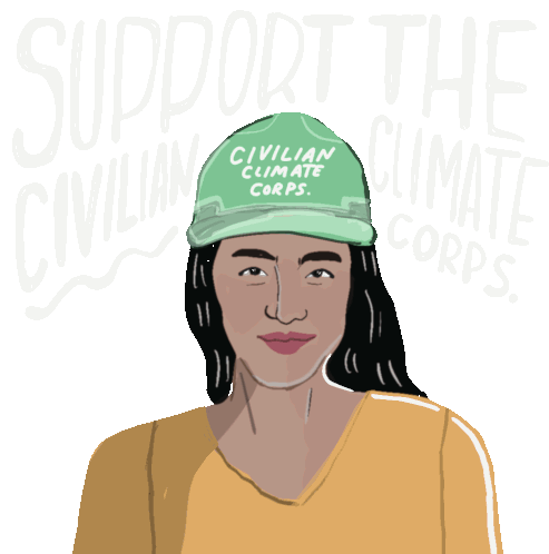 An animated sticker featuring diverse individuals wearing green hard hats, advocating for the Civilian Climate Corps and the Green New Deal.