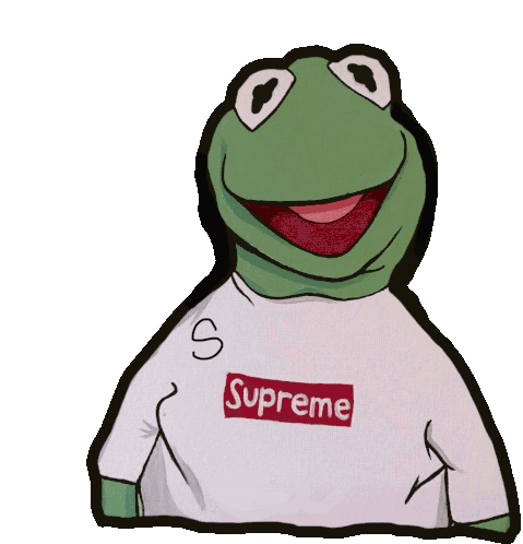Kermit the Frog, the iconic Muppet, sports a white long-sleeve t-shirt featuring the famous red Supreme box logo and '@seekism' branding.