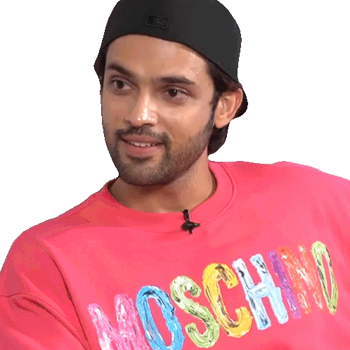 Parth Samthaan, wearing a pink Moschino sweater and black cap, nods and says 'Sure' with a friendly expression.