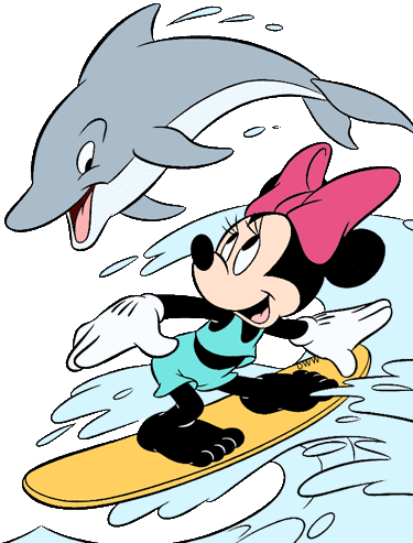 a cartoon of minnie mouse riding a surfboard with a dolphin in the background