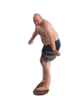 A bald man in swim shorts skillfully balances on a surfboard, showcasing impressive balance and core strength.