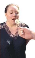 A woman reacts with a comically surprised and shocked expression after being playfully punched in the mouth as part of a prank.