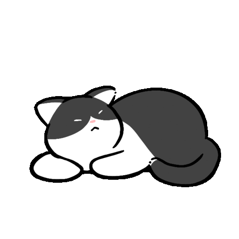 A cute black and white cartoon cat is curled up, peacefully sleeping or resting.