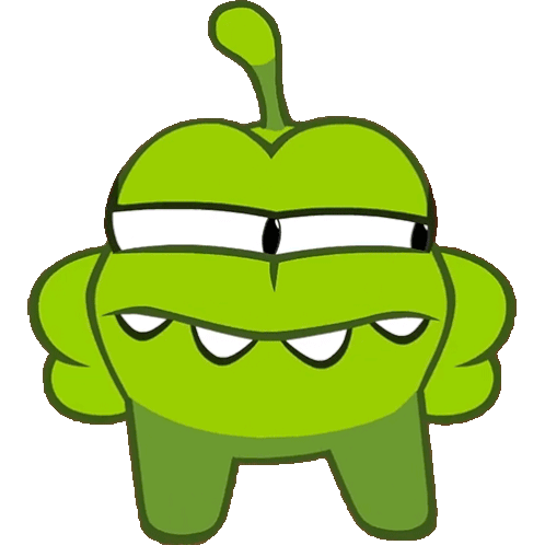 Om Nom, the green character from Cut the Rope, looks around with a suspicious and curious expression.