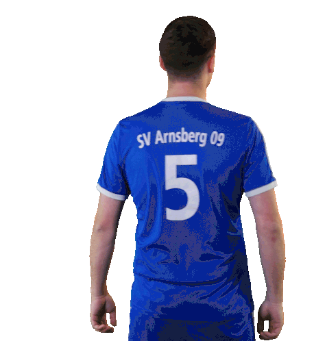 A male SVA Arnsberg football player in a blue jersey, turning and crossing his arms, ready for action.