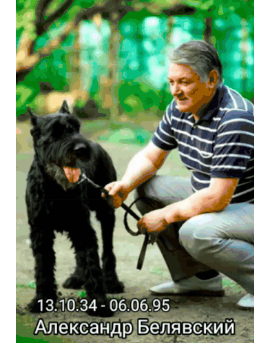 a man is kneeling down next to a large black dog with the date 13.10.31 on the bottom