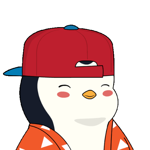 A cool cartoon penguin with a red cap and orange shirt nods, showing agreement or approval with a blush.