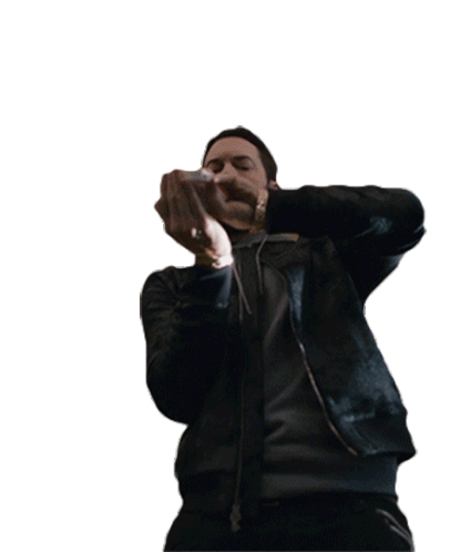 Eminem is shown quickly tilting his head back to swallow something from a small bottle, possibly pills or medication.