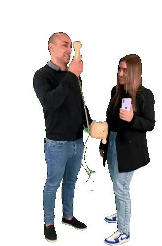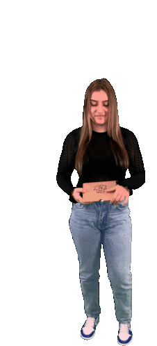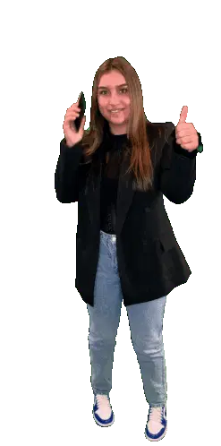 A woman unboxes a red phone from a small cardboard box, smiles, and then puts it to her ear as if making a call.
