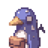 Nervous Prinny pixel art with sweatdrops, holding a bucket of food. A cute, anxious penguin character from Disgaea.