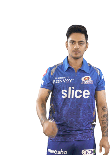Ishan Kishan, wearing a Mumbai Indians jersey, wipes sweat from his brow, showing effort and concentration.