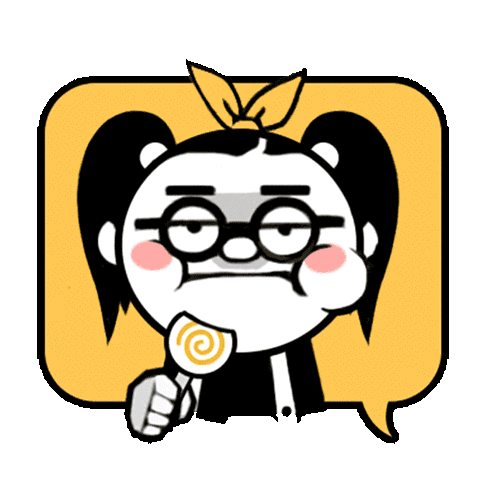 A cute cartoon girl with pigtails and glasses enjoys a sweet lollipop, showing a focused and slightly grumpy expression.