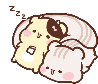 Two adorable hamsters from Sweet House snuggled together, one sleeping peacefully with 'Zzz' above its head.