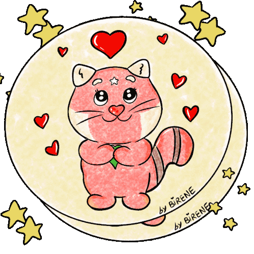A cute animated red panda character by Birene, surrounded by sparkling stars and hearts, holding a green leaf.
