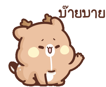 A cute Sweethouse Happy Deer character waves goodbye, holding a tiny coffee cup, with 'Bye Bye' in Thai.